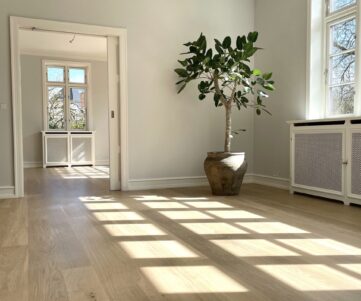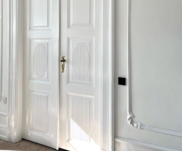 Gennemgribende renovering af ejendom på omtrent 400 kvm, hvor vi bevarede de originale detaljer såsom stuk, døre og trappe, og gav palæet nyt liv ved at udskifte alle vinduer, opbygge alle væggene, vindueskarme og fodlister med respekt for husets sjæl.
