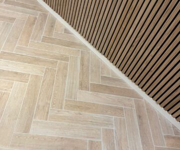 Vi lagde sildebensparket på stueetagen samt sildebensfliser på to badeværelser på gulv og væg.